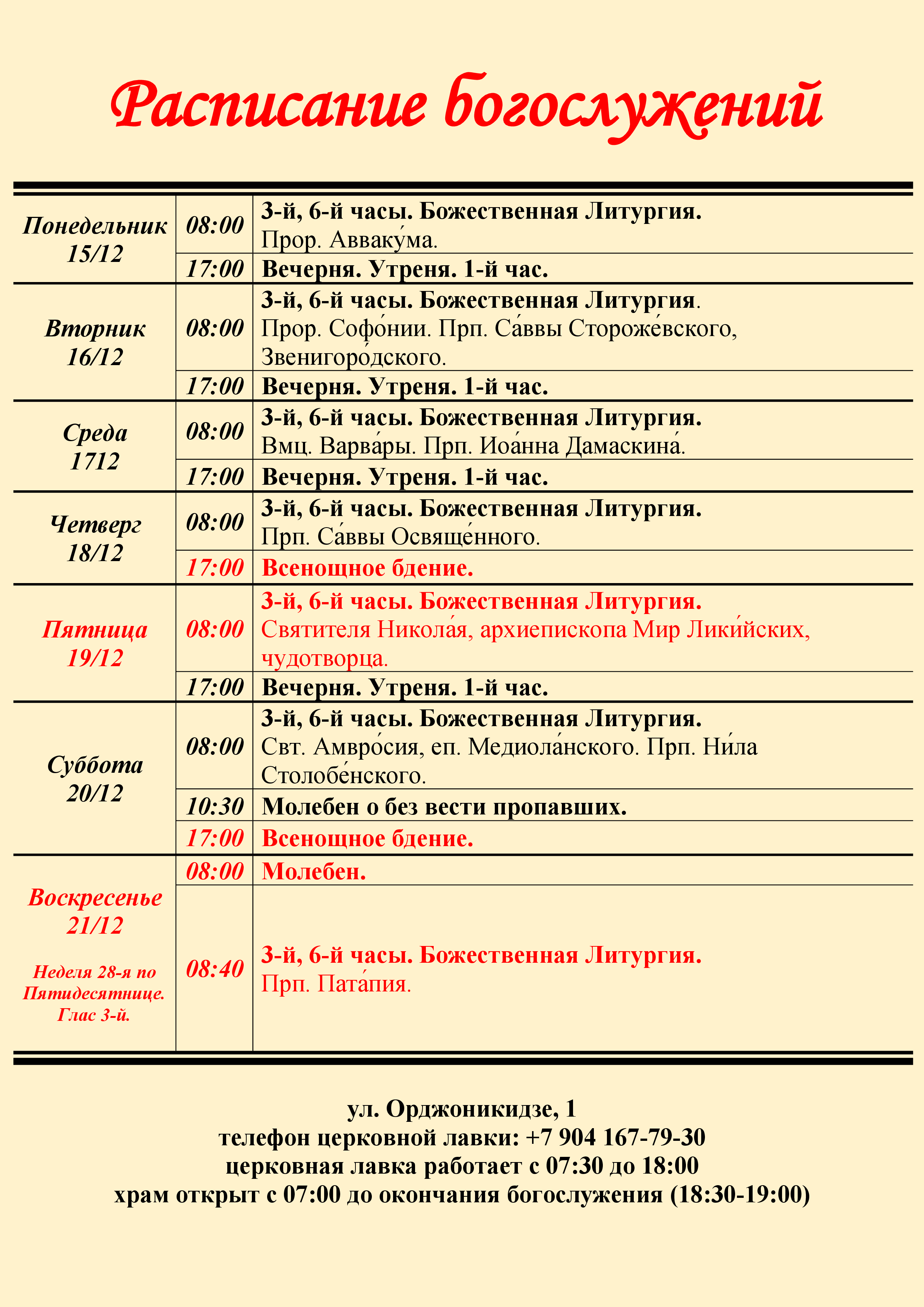 храм открыт с 07:00 до окончания богослужения (18:30-19:00)